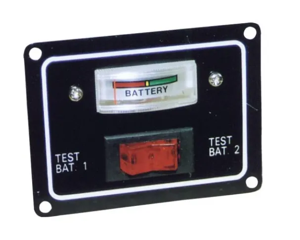 Black finished aluminium panel with simple colour coded gauge. Illuminated rocker switch selects test condition of battery one or two. Suits 12 volt.