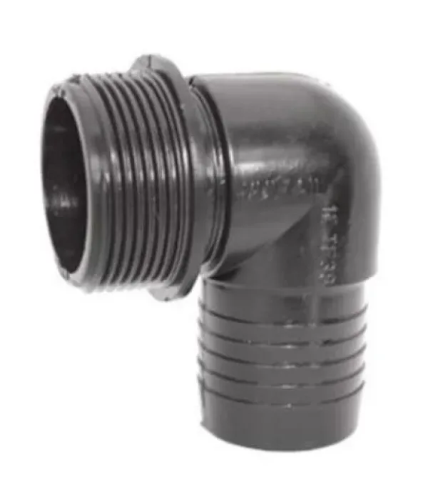 Elbow joiner – male (external) BSP thread to barbed hose tail.