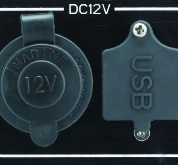 A splashproof panel made from black aluminium plate with 1 x cigarette lighter socket and 1 x USB charger socket.