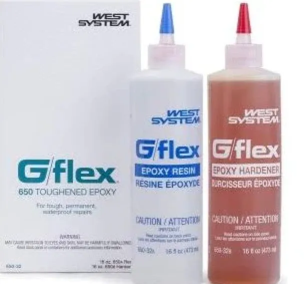 G/flex 650 is a toughened, versatile, liquid epoxy for permanent waterproof bonding of fiberglass, ceramics, metals, plastics, damp and difficult-to-bond woods. With a modulus of elasticity of 150,000 PSI, it is a bit more flexible than standard epoxies and polyester, but much stiffer than adhesive sealants. This gives it the ability to make structural bonds that can absorb the stress of expansion, contraction, shock, and vibration. It is ideal for bonding dissimilar materials. It can be modified with WEST SYSTEM fillers and additives and used to wet-out fiberglass tapes and fabrics. Mixed at a 1:1 ratio, this 2-part epoxy gives you 46 minutes of pot life at 72°F and an open (working) time of 60-75 minutes. It reaches an initial cure in 3 to 4 hrs and a workable cure in 7-10 hours.