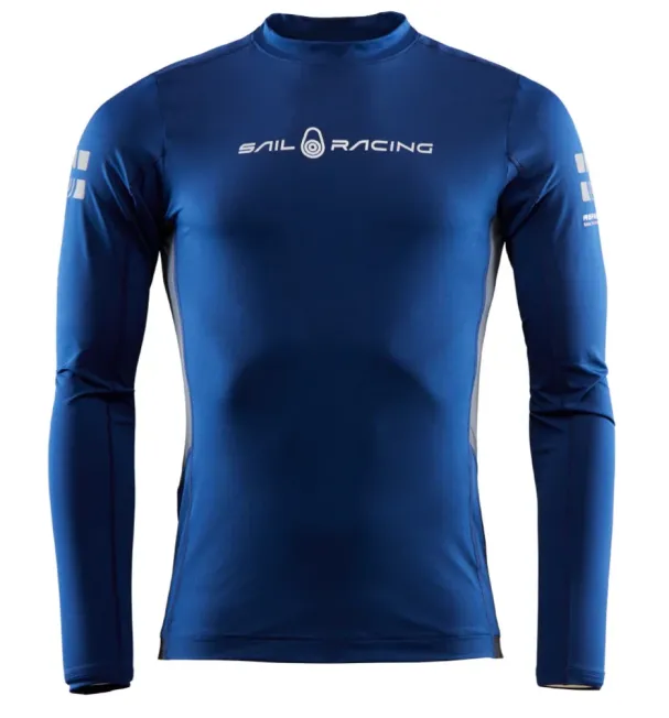 Reference LONG Sleeve Rashguard made in a quickdry stretch polyamide fabric. Anti-glide tape on inside bottom hem. Reflective prints at shoulders and Sail Racing logo graphic at chest and at back yoke.
